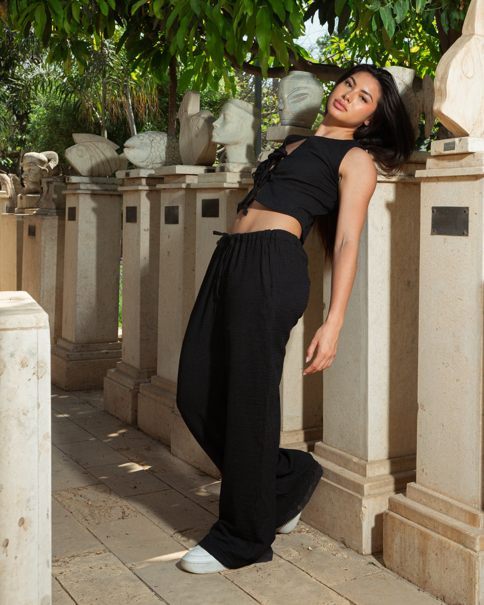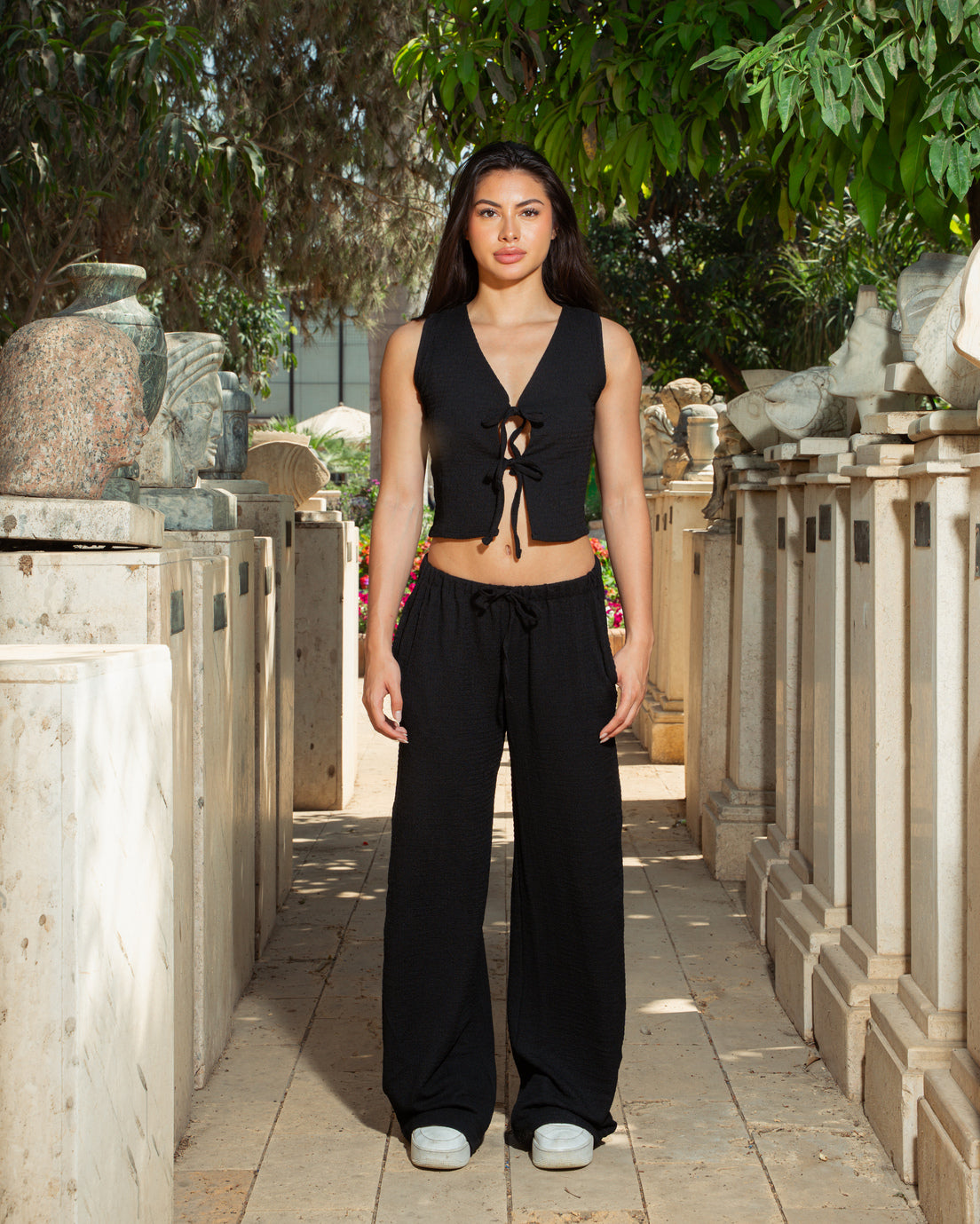 Light, airy, and made for summer. This sleeveless top features a flattering V-neckline with playful tie-front details, crafted from soft crinkle fabric that keeps you cool and stylish. Pair it with the matching pants for an effortless warm-weather look.