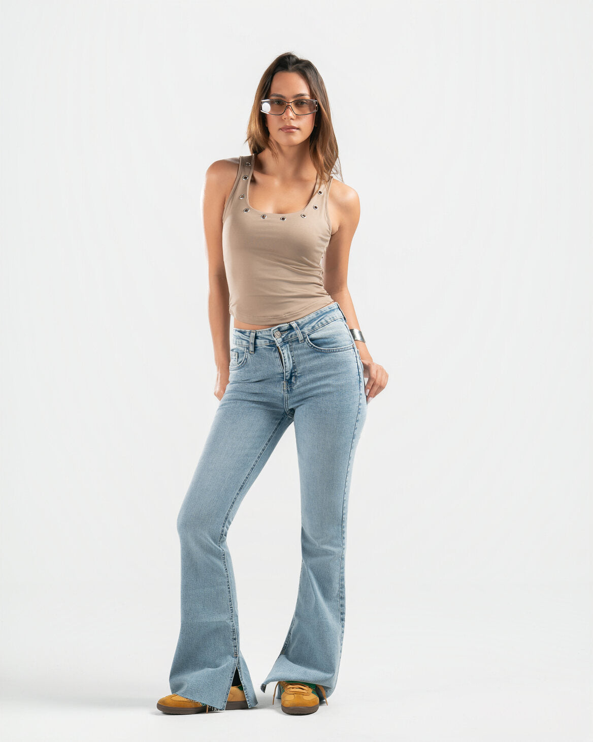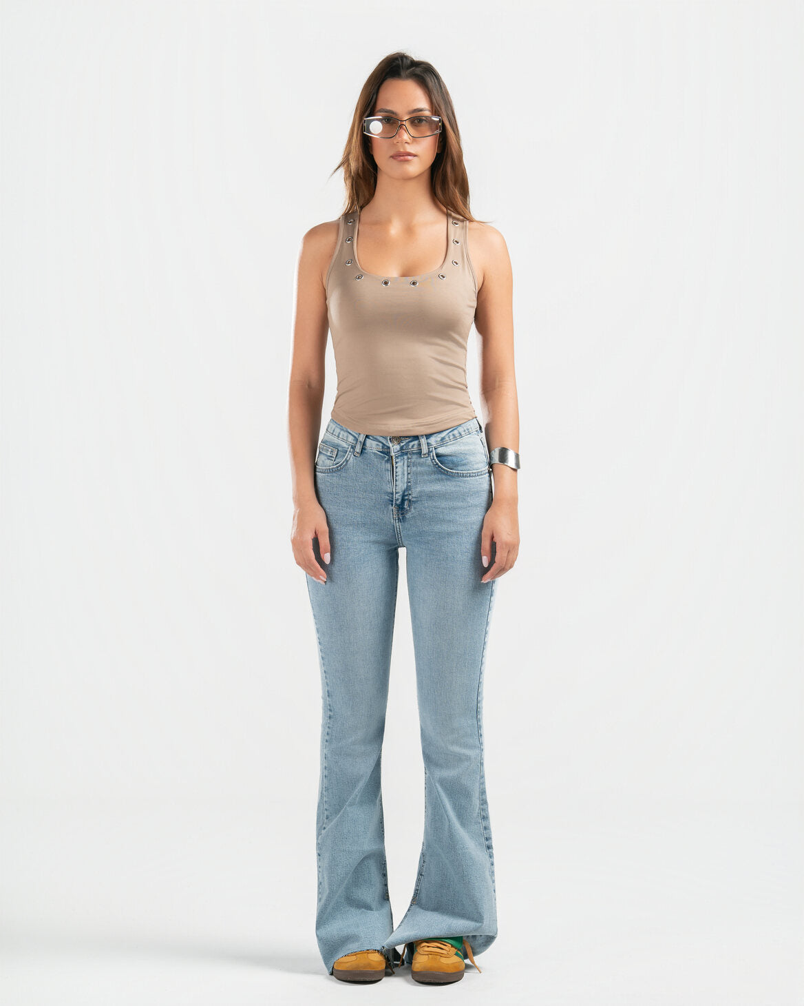 A minimal silhouette with a sharp edge. This fitted tank is crafted from soft stretch fabric and finished with metal stud detailing along the neckline, adding just the right amount of attitude. Designed to contour the body and elevate everyday styling; wear it solo or layered.